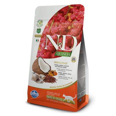 Πλήρης τροφή, χωρίς σιτηρά και χωρίς γλουτένη, με ρέγγα, καρύδα, κουρκουμά και κινόα, για ενήλικες γάτες με τροφικές δυσανεξίες ή για την αποκατάσταση του δέρματος και του τριχώματος. Η τροφή αυτή είναι εξαιρετικά εύπεπτη, έχει χαμηλό επίπεδο λίπους και υψηλά επίπεδα διαλυτών ινών. Περιέχει χονδροϊτίνη και γλυκοζαμίνη που βοηθούν στην υγεία των αρθρώσεων καθώς και φρουκτοολιγοσακχαρίτες που βοηθούν στην ανάπτυξη των καλών βακτηριδίων του εντέρου. Χάρη στο σύστημα επιχρύσωσης εν κενώ, μία μοναδική τεχνολογία που αποτρέπει τη θερμική καταπόνηση των βιταμινών, οι βιταμίνες διατηρούν για μεγαλύτερο χρονικό διάστημα την αποτελεσματικότητά τους. Η τροφή συσκευάζεται σε προστατευτική ατμόσφαιρα με τη χρήση αζώτου αντί για οξυγόνο και έτσι τα θρεπτικά συστατικά της διατηρούνται αναλλοίωτα με την πάροδο του χρόνου. Πρόκειται για μια γευστική τροφή, υψηλής βιολογικής αξίας, η οποία είναι πλούσια σε θρεπτικά συστατικά που ανταποκρίνονται στις ειδικές ανάγκες της γάτας σας.