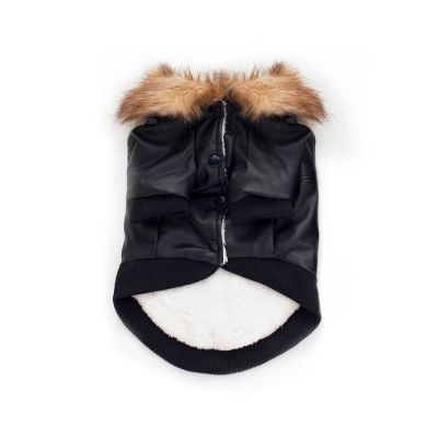 Κομψό μπουφάν για σκύλους σε μαύρο χρώμα με επένδυση γούνας και κουκούλα με γούνινο τελείωμα. Προσφέρει προστασία από το κρύο, διατηρώντας τον σκύλο σας ζεστό και στιλάτο τις χειμερινές ημέρες. Ιδανικό για βόλτες σε χαμηλές θερμοκρασίες.