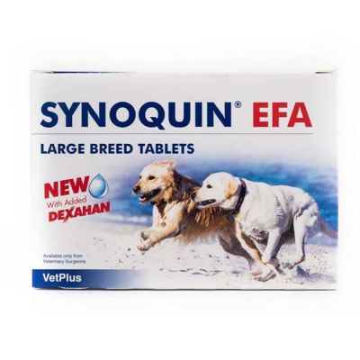 | Διατροφή | Τα εξαιρετικά εύγευστα δισκία δισκία (Χάπια) του synoquin EFA μπορούν να χορηγούνται κατευθείαν στον σκύλο σας ως λιχουδιά ή σπασμένα μπορούν να αναμειχθούν μαζί με τροφή. Μην μειώσετε την προτεινόμενη δοσολογία αν δεν συμβουλευτείτε πρώτα τον κτηνίατρο σας. Για να διασφαλίσετε το μέγιστο όφελος είναι πολύ σημαντικό να ολοκληρωθεί η αρχική χορήγηση εφόδου. Δοσολογία: Αρχικό πρόγραμμα έξι εβδομάδων: 25-40kg: 3 δισκία την ημέρα (2 πρωί, 1 βράδυ) >40kg: 4 δισκία την ημέρα (2 πρωί, 2 βράδυ) Πρόγραμμα συντήρησης – μακροπρόθεσμα: Όλα τα σκυλιά ανταποκρίνονται διαφορετικά στα συμπληρώματα. Ωστόσο μετά την αρχική χορήγηση του προγράμματος εφόδου η ημερήσια δόση μπορεί να μειωθεί σε: 25-40kg: 1 δισκίο την ημέρα >40kg: 2 δισκία την ημέρα