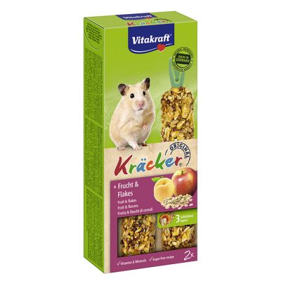 Τραγανό κράκερ με βρώμη και φρούτα, για χάμστερ. Ψήνεται σε φυσικό ξύλο για μεγάλη διάρκεια και απασχόληση. Περιέχει φυσικά φρούτα που προσφέρουν ενέργεια και ποικιλία στη διατροφή, και βοηθά στη φυσική φθορά των δοντιών. Η συσκευασία περιέχει 2 κράκερ.